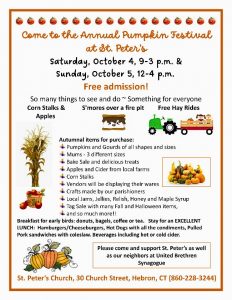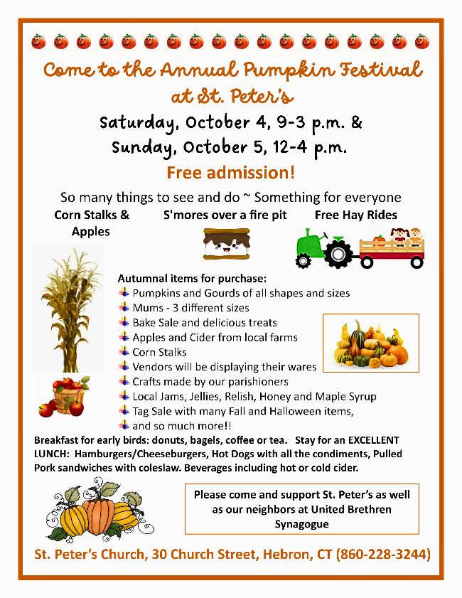 Pumpkin Fest!! October 4, 2025 – October 5, 2025 9-4 Saturday 10/4 from 9-3 & Sunday 10/5 from 12-4. Join folks across Hebron and the surrounding towns for a weekend of fun with corn stalks and good food and hay rides!
